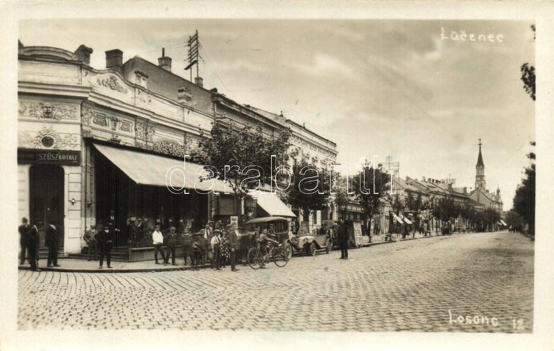 Leírás: Losonc, Lucenec; Szüsz kávéház, kerékpár, taxi, automobilok, Gansel Gáspár üzlete / café, bicycle, automobiles, shops (EK)
