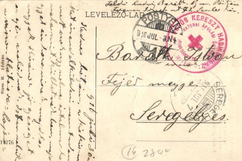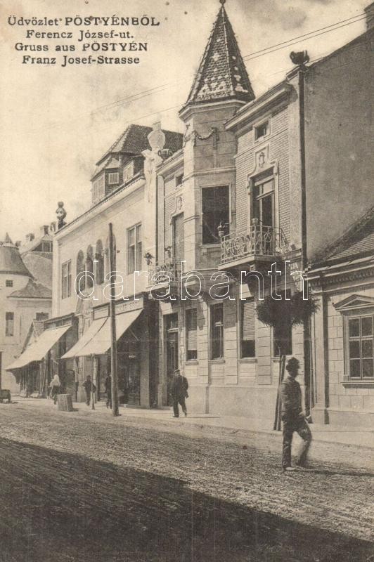 Pöstyén, Piestany; Ferenc József út, Buchler Samu üzlete + "Portómentes Vörös Kereszt Hadikórház" pecsét / street, shops, Art Nouveau + Red Cross Military hospital stamp on the backside (EK)