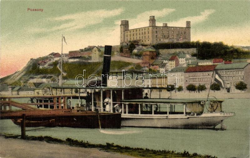 Leírás: Pozsony, Pressburg, Bratislava; Pozsony gőzüzemű csavaros személyhajó a várral / Hungarian passenger steamship