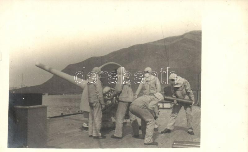 A fedélzeti ágyú töltése löveggel, vegyi támadáshoz védőruhába öltözött matrózok / K.u.K. Kriegsmarine / WWI Austro-Hungarian Navy mariners reload the cannons, dressed in protective clothing against chemical attack. photo