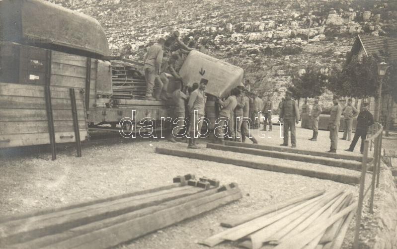 Abladen der Kriegsbrücken-materials durch die 5/7 Pion. Comp. / Osztrák-magyar katonák pontonhíd elemeket szállítanak vasúttal / WWI Austro-Hungarian K.u.K. soldiers unload war bridge (pontoon bridge) materials from trains. photo