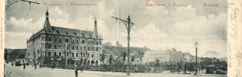 Leírás: Budapest II. Margit körút, Lukács fürdő, Margit Park kávéház, villamos. Divald Károly 372. sz. kihajtható panorámalap / panoramacard (EK)