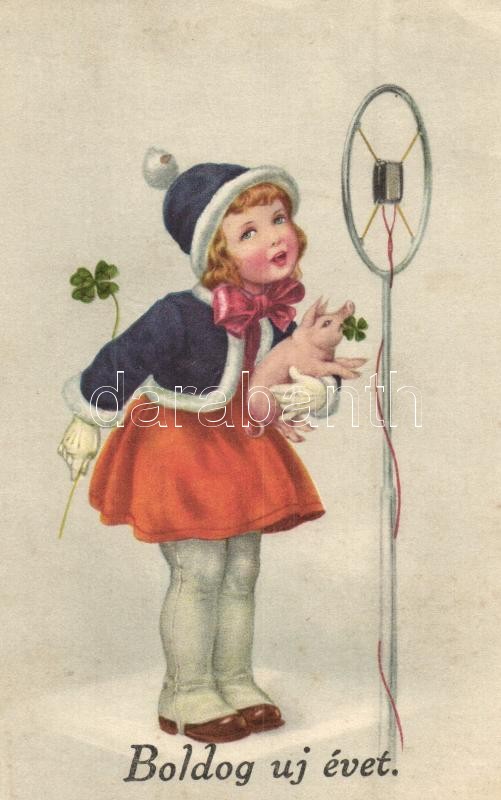 Boldog Új Évet / New Year greeting art postcard with singing girl and ... https://www.darabanth.com/hu/317-Gyorsarveres/317.0/Kepeslapok/Udvozlolapok-Unnepek~1000081/Boldog-Uj-Evet-New-Year-greeting-art-postcard-with-singing-girl-and-pig-Erika-Nr-6169-EK~II1747665