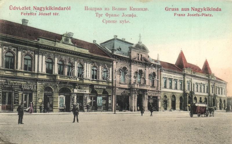 Nagykikinda, Kikinda; Ferenc József tér, Nemzeti szálloda, Sztojkov, Breijere, Tésits K., Gyurgyev M., Joannovits István és Koszta Popov üzlete, gyógyszertár / square, hotel, shops, pharmacy (EK)