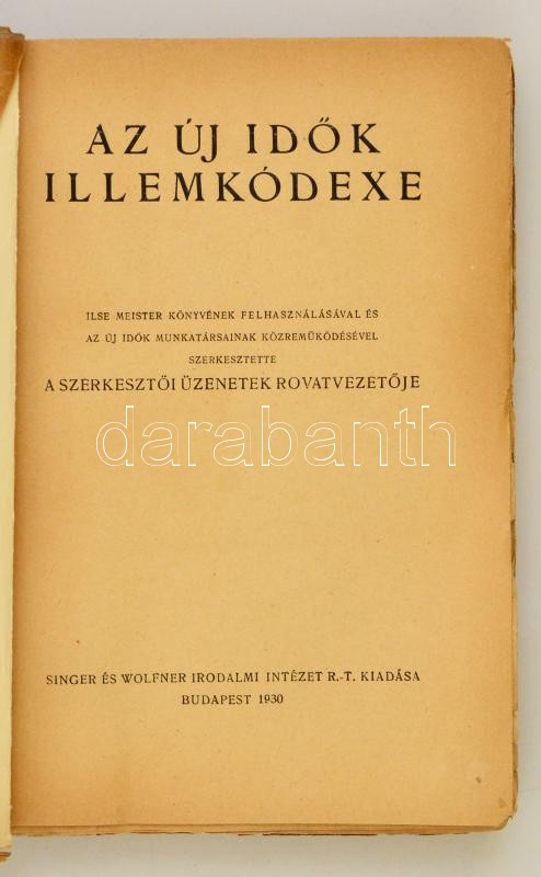 Az új idők illemkódexe. Bp., 1930, Singer és Wolfner. Kiadói papírköté... https://www.darabanth.com/hu/317-Gyorsarveres/317.0/Konyvek/Konyvek-Egyeb-ritkasagok~2500016/Az-uj-idok-illemkodexe-Bp-1930-Singer-es-Wolfner-Kiadoi-papirkotes-javitott-gerinccel~II1744019