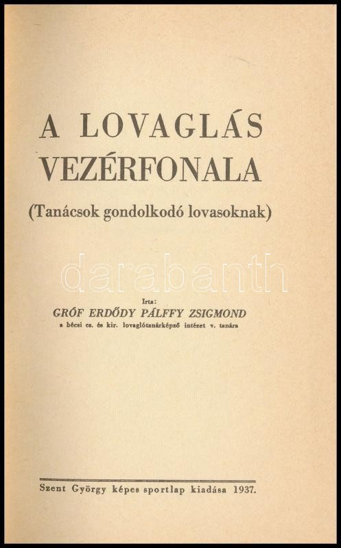 Gróf Erdődy Pálffy Zsigmond: A lovaglás vezérfonala. Tanácsok gondolkodó lovasoknak. Bp., 1937, Szent György Képes Sportlap. Reprint, kiadói kartonált kötés, kissé foltos.