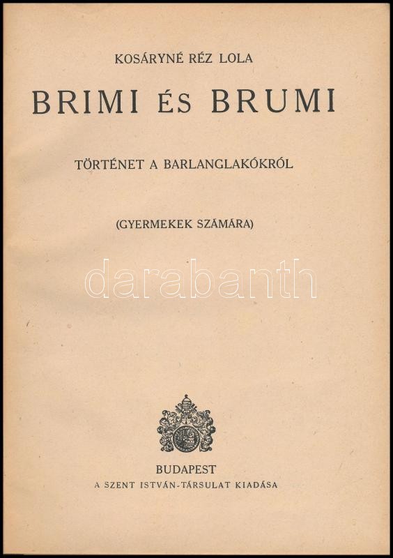Kosáryné Réz Lola: Brimi és Brumi. Történet a barlanglakókról. (Gyermekek számára.) Bp.,é.n., Szent István-Társulat. Kiadói illusztrált félvászon-kötés, kopott borítóval.