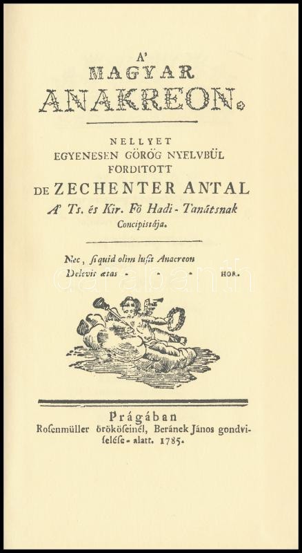 Zechenter Antal: A' magyar Anakreon. 1785-ben, Prágában Rofenmüller örököseinél, Beránek János gondviselése alatt megjelent könyv reprint mása. Bp., é.n., Anakreon. Kiadói kartonált kötés, jó állapotban.