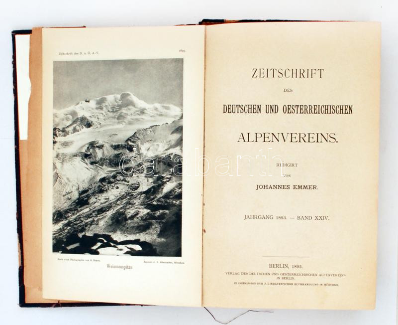 Johannes Emmer (szerk.): Zeitschrift des Deutschen und Oesterreichischen Alpenvereins. Jahrgang 1893. Berlin. Viseltes egészvászon kötésben. Térképmelléklettel.