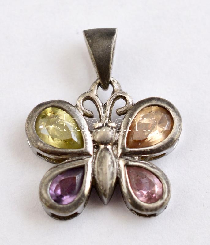 Ezüst(Ag) színes kövekkel díszített pillangós függő, jelzett, 2x1,6 cm... https://www.darabanth.com/hu/317-Gyorsarveres/317.0/Nemesfem-Disztargyak-Orak-es-Ekszerek/Nemesfem-Disztargyak-Orak-es-Ekszerek~35/EzustAg-szines-kovekkel-diszitett-pillangos-fuggo-jelzett-2x1-6-cm-brutto-2-2-g~II1742978