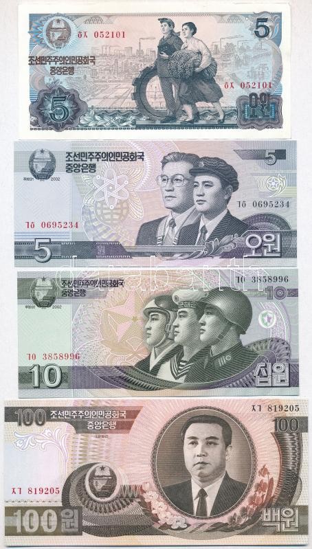 North Korea 19... https://www.darabanth.com/hu/317-Gyorsarveres/317.0/Numizmatika/Kulfoldi-bankjegyek~2000011/Eszak-Korea-1978-5W-plus-1992-100W-plus-2002-5W-plus-10W-TI--North-Korea-1978-5-Won-plus-1992-100-Won-plus-2~II1743378