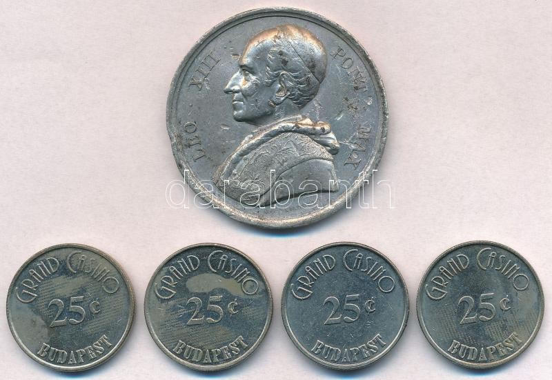 Vatikán ~1900. "XIII. Leó pápa" fém emlékérem, erősen sérült tokban, a tok belső felén négy kaszinó zseton (43mm) T:3 több ph. és ü.