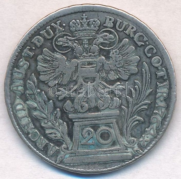 Aust... https://www.darabanth.com/hu/317-Gyorsarveres/317.0/Numizmatika/Kulfoldi-fem-es-ezustpenzek~2000012/Ausztria-1764-20kr-Ag-Maria-Terezia-6-44g-T2-3---Austria-1764-20-Kreuzer-Ag-Maria-Theresi~II1744945
