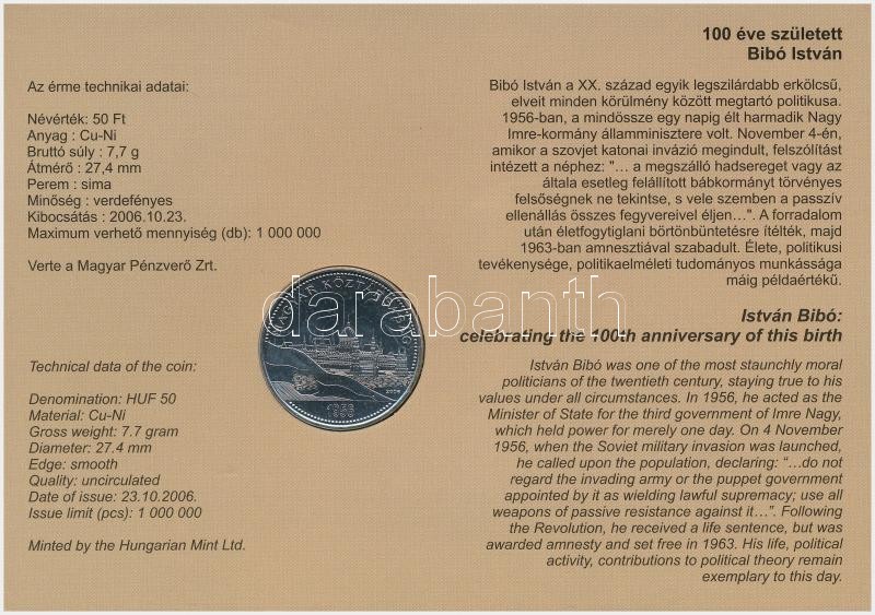 2006. 50Ft "100 éve született Bibó István" emlékkiadás emléklapon T:1 https://www.darabanth.com/hu/317-Gyorsarveres/317.0/Numizmatika/Magyar-es-magyar-verdejelu-fem-es-ezustpenzek~2000007/2006-50Ft-100-eve-szuletett-Bibo-Istvan-emlekkiadas-emleklapon-T1~II1747092