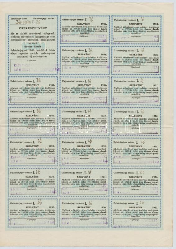 Leírás: 1924. "Kálmáncsai Hitelszövetkezet" névre szóló tízezer üzletrészjegye egyben, összesen 1.000.000K-ról, szelvényekkel T:II