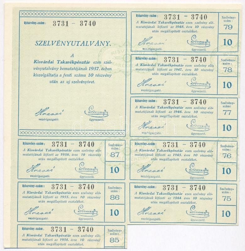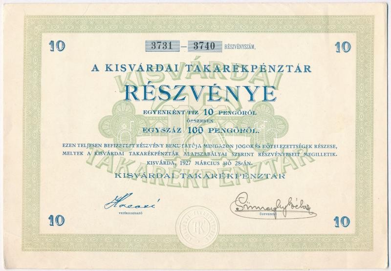 Leírás: Kisvárda 1927. "A Kisvárdai Takarékpénztár" részvénye egyenként 10P-ről szelvényekkel és szárazpecséttel T:I-