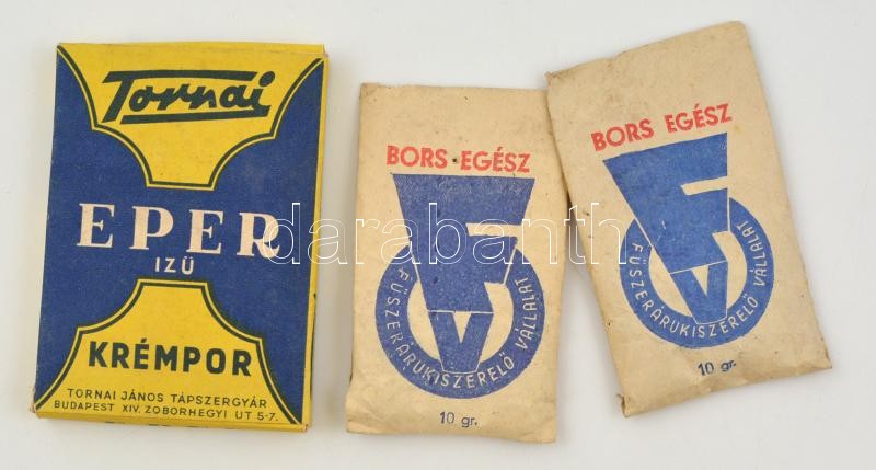 Leírás: 2 db Fűszerárukiszerelő Vállalat egészborsos zacskó, tartalommal + Tornai eper ízű krémpor doboz, tartalommal