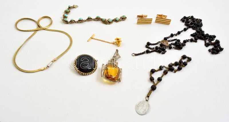 Leírás: Bizsu tétel: karkötő (nem záródik), rózsafüzér ( kereszt nélkül), mandzsetta, egyiptomi kitűző, nyaklánc, kitűző, összesen: 8 db