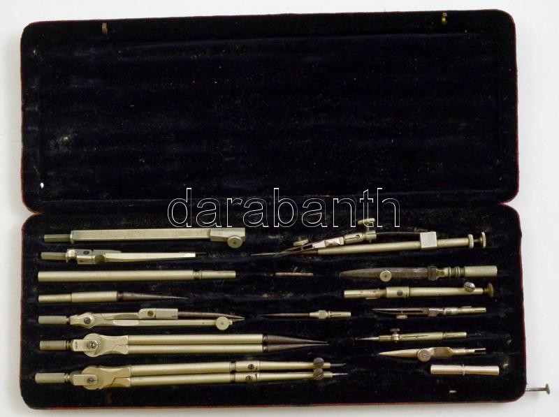Leírás: C. Riefler régi körzőkészlet, egy hiányzik, kopott dobozban, 26×11 cm
