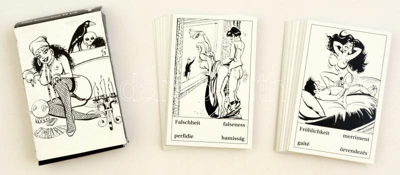 Leírás: Erotikus-humoros jóskártya pakli, 1+36+5 lapos. Sorszámozott, 76. számú pakli. Joker International 99 LTD. Eredeti dobozában, jó állapotban.