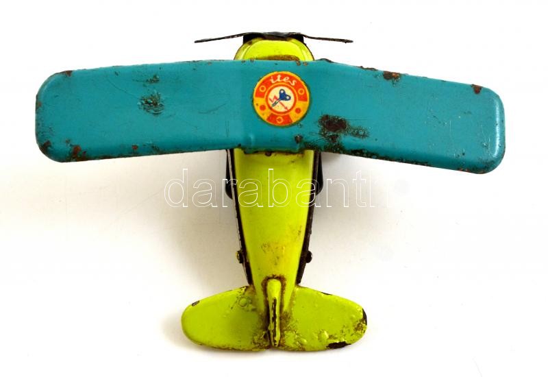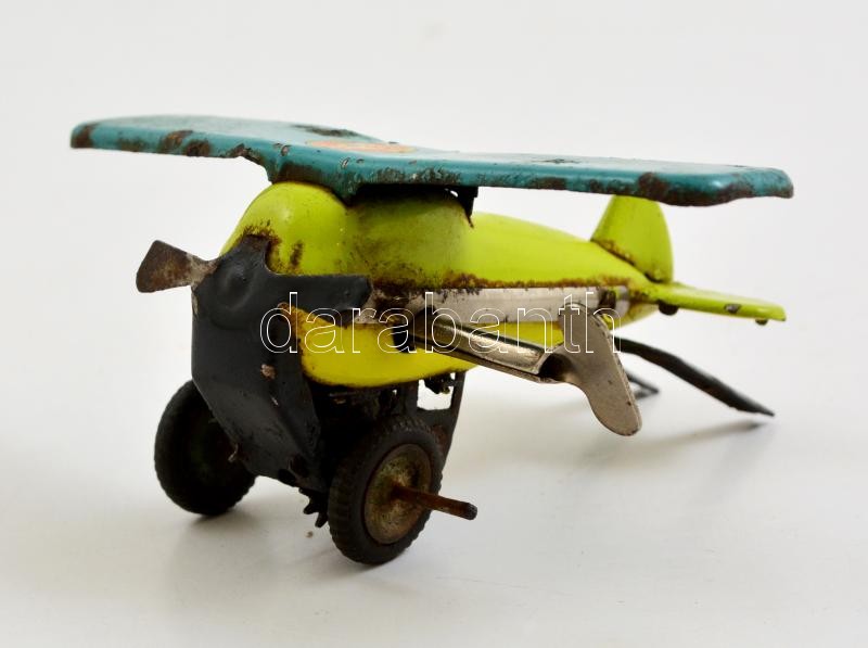 Leírás: Felhúzós fém játék repülőgép, kulccsal, kicsit rozsdás, 13×10×7 cm