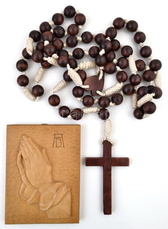 Leírás: Jelzés nélkül: Albrecht Dürer imádkozó kéz, faragott fa falikép, 19,5x15 cm + óriás fa rózsafüzér, h: 170 cm