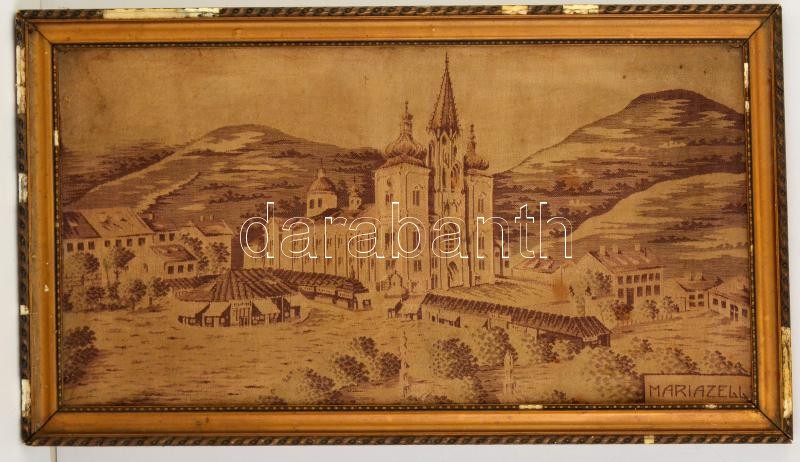 Leírás: Máriacelli emlék gobelinkép, foltos, sérült keretben, 38×75 cm