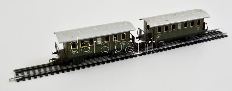 Leírás: Marklin fém vagonok és 2 db egyenes sín (H0), kopott, h:12 (2×) cm, h:17 cm (2×)