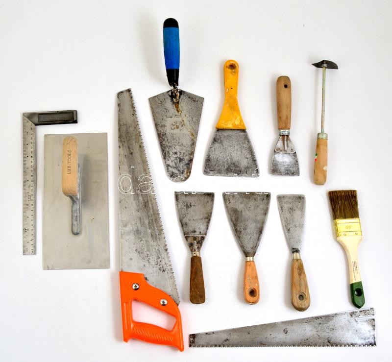 Leírás: Nagy vegyes barkácstétel, összesen 12 db, köztük ecset, fűrész, spakli, simító