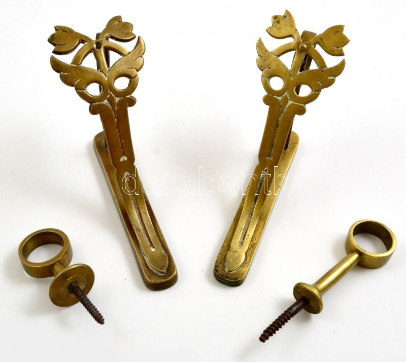Leírás: Régi réz függönyrúdtartó (egy pár+ két különböző), összesen: 4 db, 15×12 cm (2×), h:10 és 13 cm
