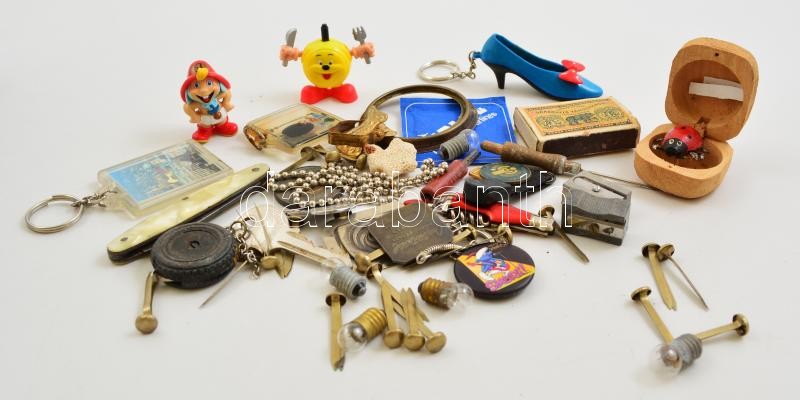 Leírás: Vegyes kis bolha tétel: bicskák, kulcstartó, játék, stb.