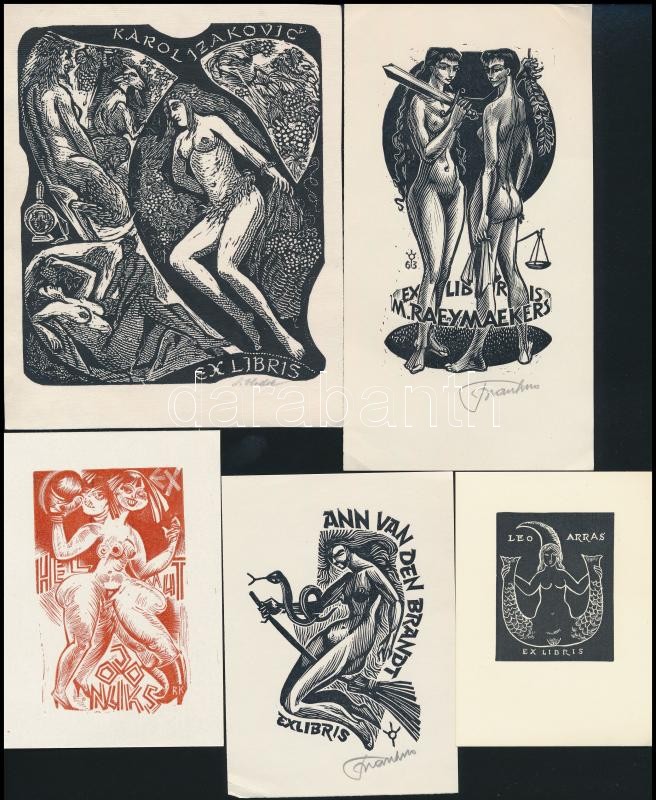 Leírás: 5 db erotikus ex libris, magyar-külföldi vegyesen, fametszet, 5×4-12×10 cm
