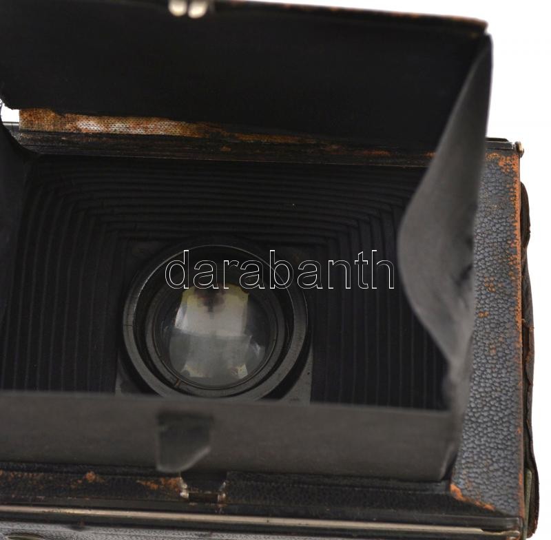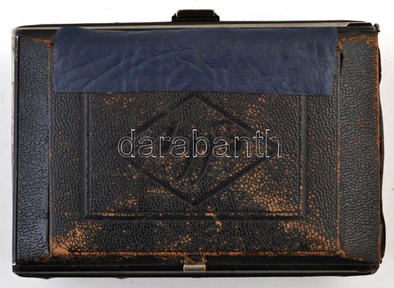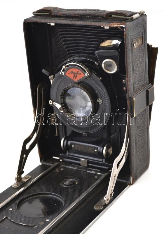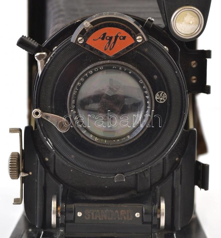 cca 1930 Agfa Standard 208 9x12 cm formátumú harmonikás fényképezőgép, Doppel-Anastigmat 1:4.5 objektívvel, 10 db síkfilm kazettával, műbőr tokban, kopottas, zárszerkezete működőképes / Agfa Standard 208 folding camera, with 10 plan film cartridge, with case, slightly worn, working condition