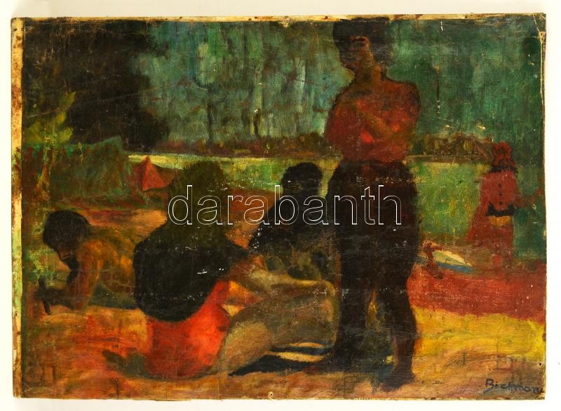 Leírás: Bachmann jelzéssel: Folyóparton. Olaj, vászon-karton, sérült, 56×79 cm