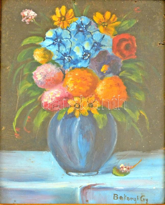 Bakonyi jelzéssel: Virágcsendélet. Olaj, karton, üvegezett keretben, 3... https://www.darabanth.com/hu/318-Gyorsarveres/318.0/Festmeny-mutargy-papirregiseg-egyeb/Festmenyek-es-grafikak~1/Bakonyi-jelzessel-Viragcsendelet-Olaj-karton-uvegezett-keretben-32C39724-cm~II1695174