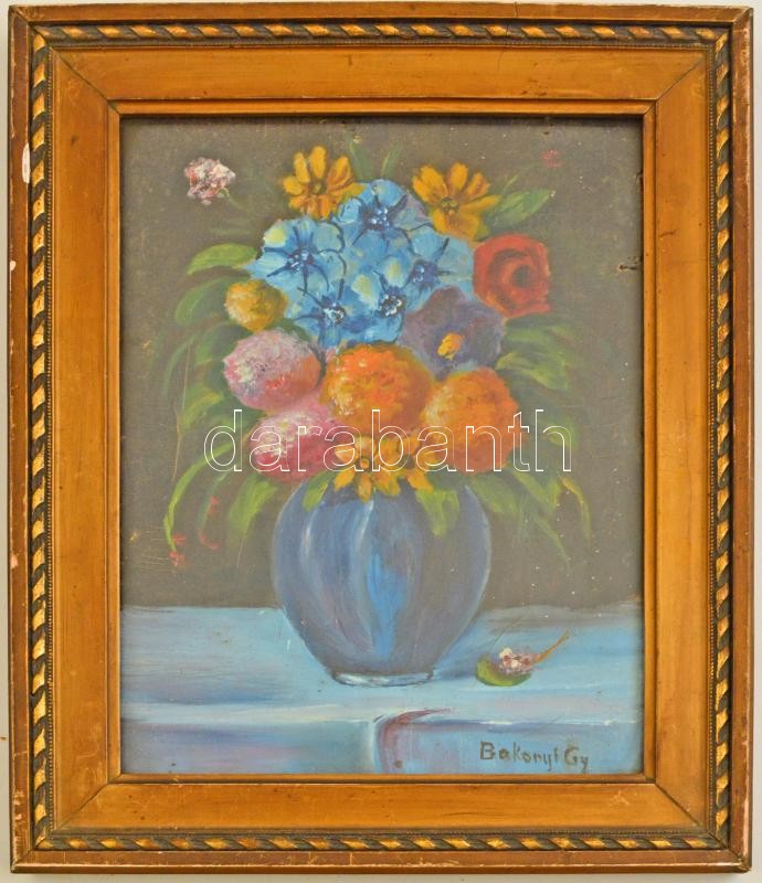 Leírás: Bakonyi jelzéssel: Virágcsendélet. Olaj, karton, üvegezett keretben, 32×24 cm