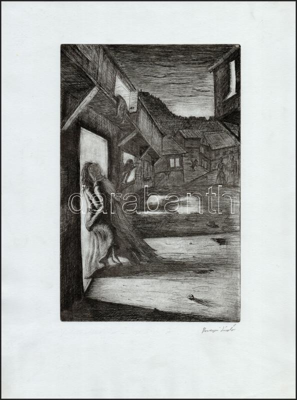 Leírás: Baranyi László(?-): Sötét utca. Rézkarc, papír, jelzett, 40x30 cm