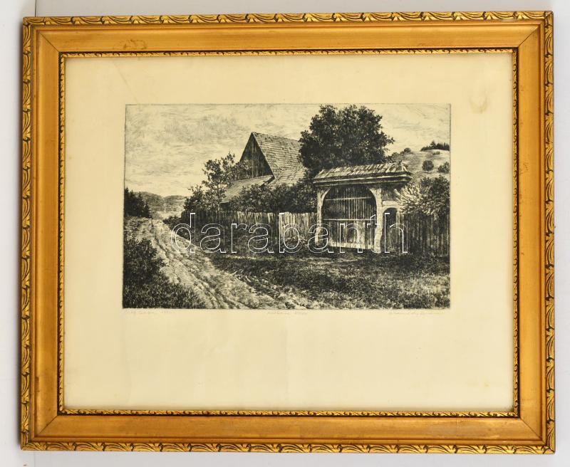 Leírás: Csanády András (1929- ): Öreg kapu. Rézkarc, papír, jelzett, üvegezett keretben, 18×30 cm