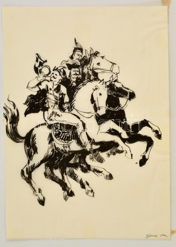 Gácsi jelzéssel: Lovasok. Tus, pauszpapír, 38×28 cm https://www.darabanth.com/hu/318-Gyorsarveres/318.0/Festmeny-mutargy-papirregiseg-egyeb/Festmenyek-es-grafikak~1/Gacsi-jelzessel-Lovasok-Tus-pauszpapir-38C39728-cm~II1731636