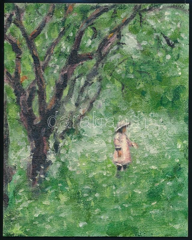 Leírás: Jelzés nélkül: Gyümölcsös kertben. Olaj, farost, 25x20 cm