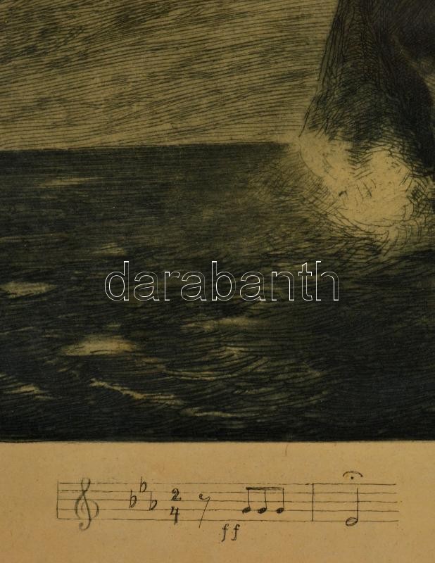 Leírás: Karl Weinhold (1867-1925): Beethoven: A vihar, rézkarc, papír, jelzett (hagyatéki), kis sérüléssel, üvegezett fa keretben, 29×34 cm
