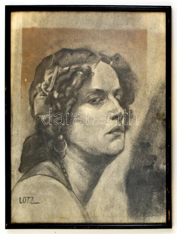 Leírás: Lotz jelzéssel: Női portré. Szén, papír, üvegezett keretben, 42×34 cm