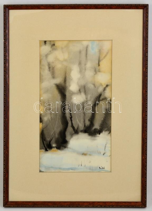 Leírás: Máthé jelzéssel: Téli erdő, akvarell, papír, jelzett, paszpartuban, üvegezett fa keretben, 41×22 cm