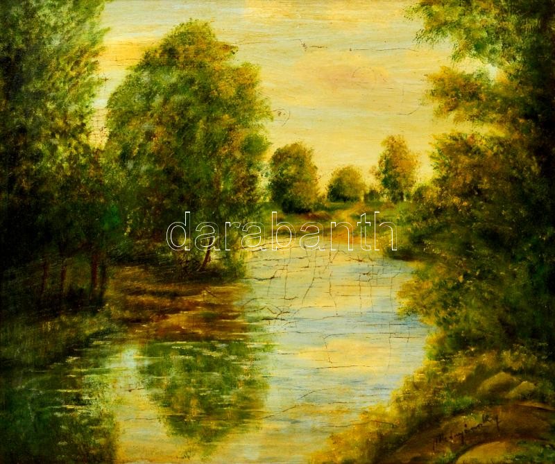 Leírás: Mednyánszky jelzéssel: Folyó part. Olaj, sérült, vászon, keretben, 33×42 cm