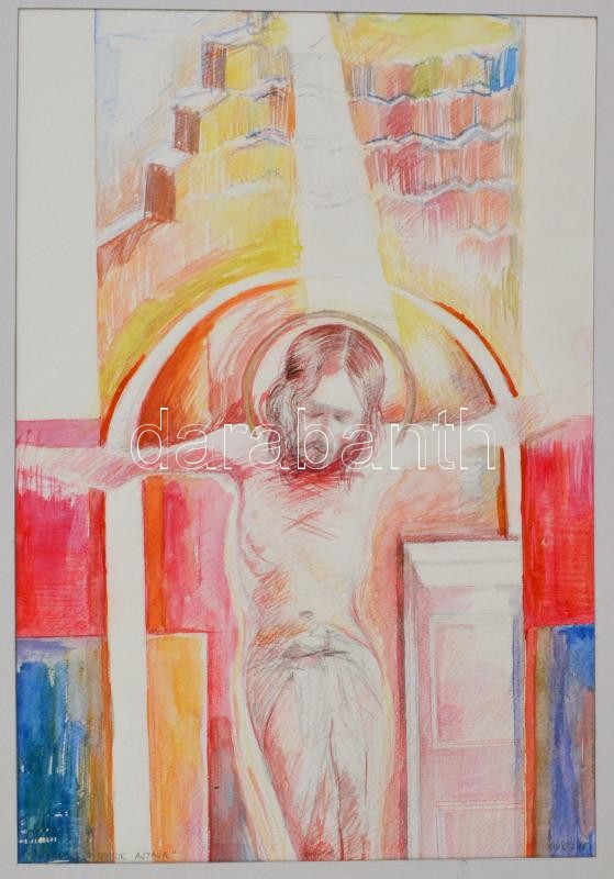 Leírás: Merényi Margit Valéria (1955- ): Én vagyok a juhok ajtaja, vegyes technika, papír, jelzett, paszpartuban, 42,5×29 cm