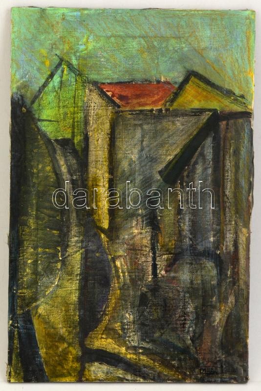 Leírás: Mhór jelzéssel: Háztetők. Olaj, vászon, sérült, 60×39 cm