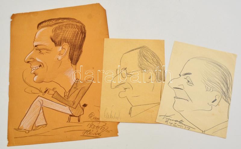 Leírás: Olvashatatlan jelzéssel: 3 db karikatúra, vegyes technika, papír, különböző méretben