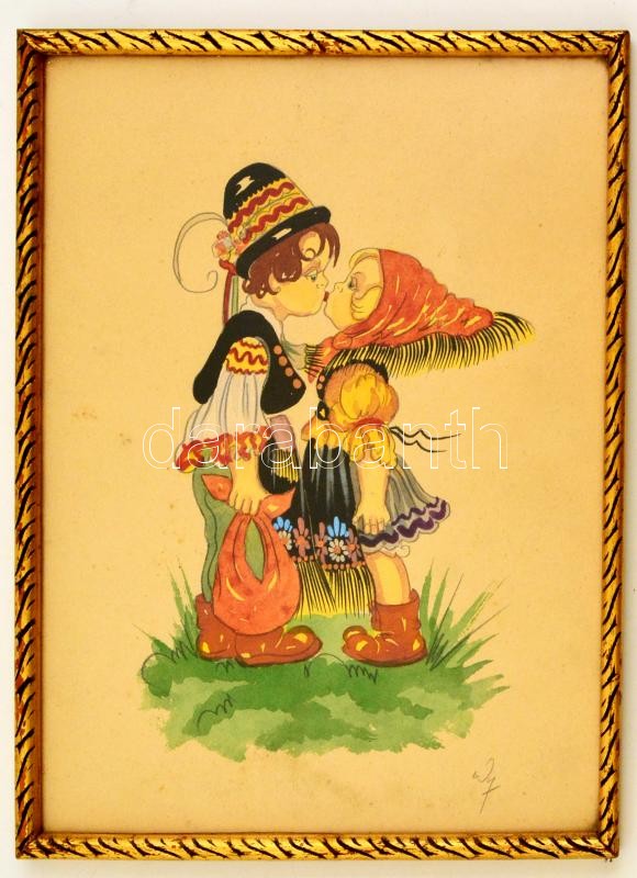 Leírás: Olvashatatlan jelzéssel: Csók. Akvarell, papír, üvegezett keretben, 33×26 cm