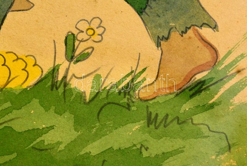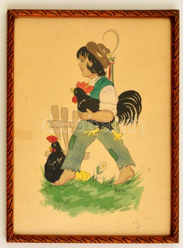 Leírás: Olvashatatlan jelzéssel: Fiú a kakassal. Akvarell, papír, üvegezett keretben, 33×26 cm
