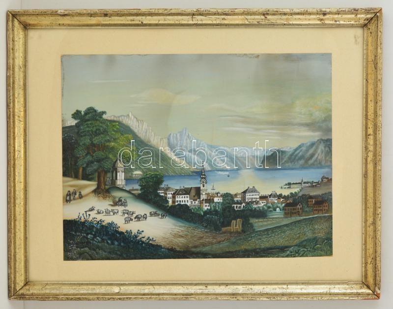 Leírás: Olvashatatlan jelzéssel: Gmunden cca 1830. Vegyes technika, papír, üvegezett keretben, 36×49 cm